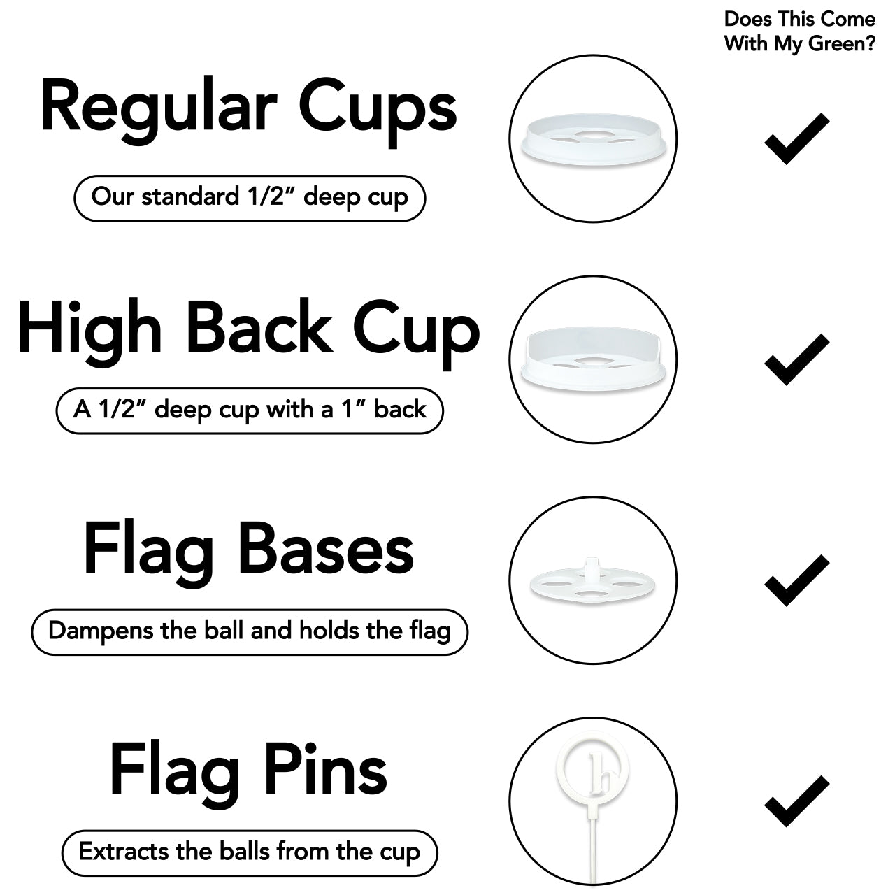 • Two Standard Cups + one High-Back Cup (to practice extra firm putts)