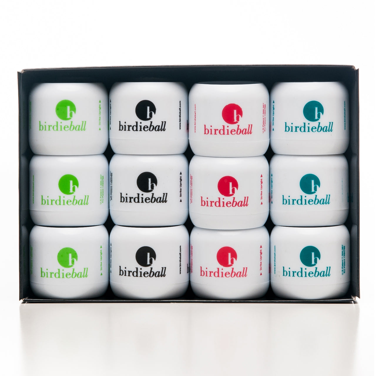 • 1 Dozen BirdieBalls (12 BirdieBalls total) Comes with four different BirdieBall logo colors packaged in a retail dozen ball box (3 green, 3 black, 3 red, 3 blue)