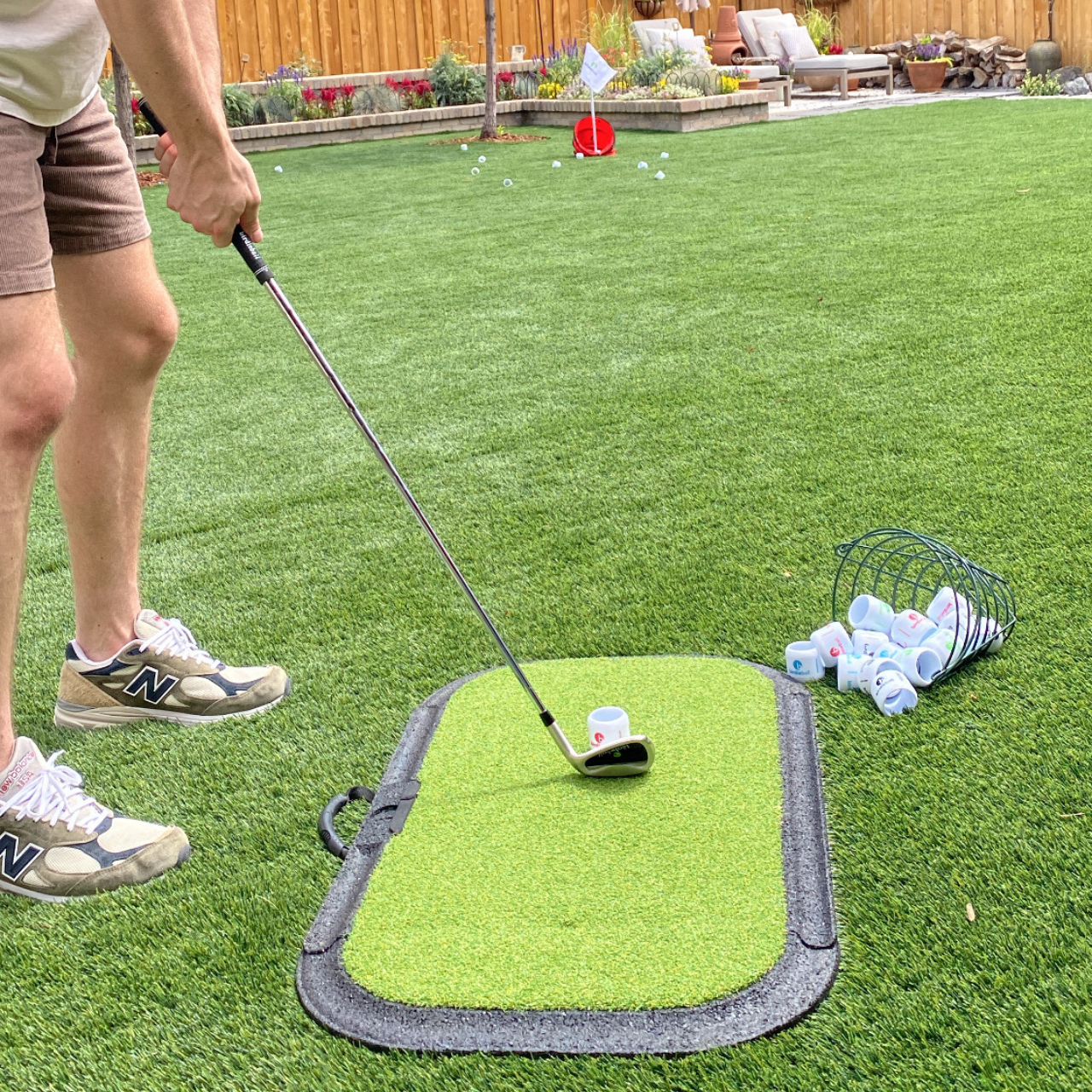 The BirdieTurf is a driving and chipping mat that you can take anywhere. Use your pitching wedge to chip off of the Birdie Turf and onto your BirdieBall putting green, or take it outside to practice a full swing. The Birdie Turf is a durable chipping mat with a heavy rubber backing, a carry handle for easy transport, and a convenient ball tray. Can be used with BirdieBalls or regular golf balls.