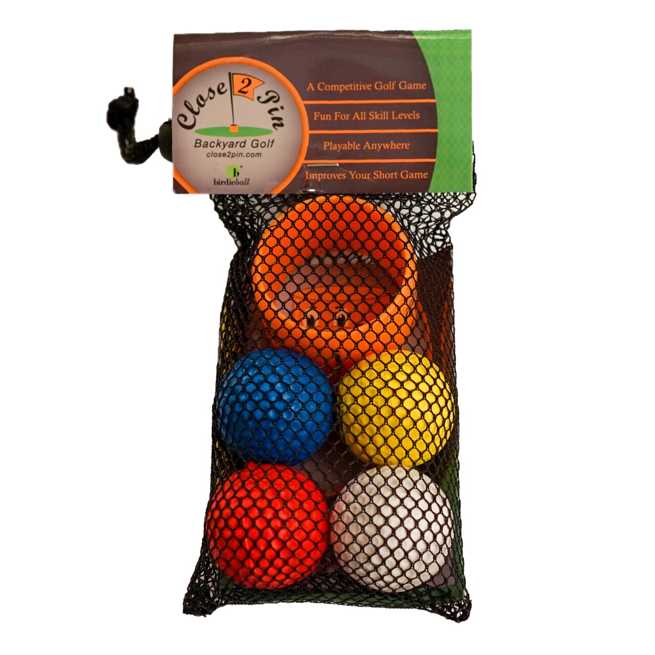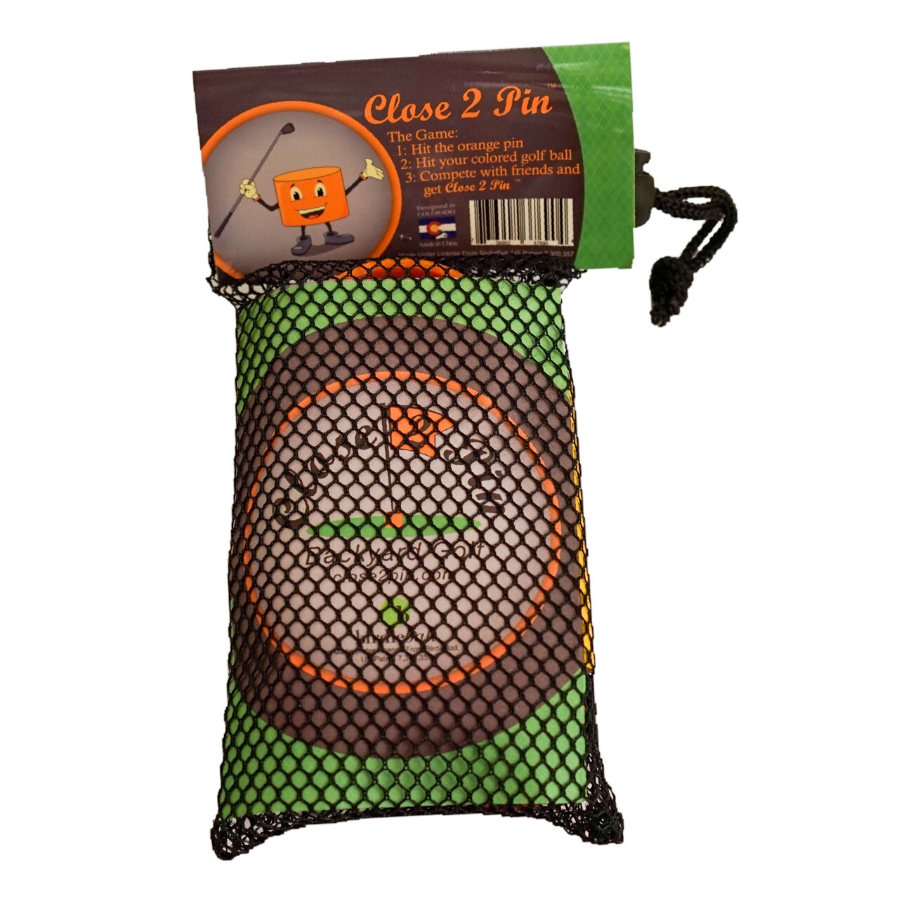 Close 2 Pin provides the excitement of golf in your own backyard in a new game that is fun for the whole family. Comes with a plastic "Pin" and four colored foam golf balls. Recommended for golfers age 3 and older. Play as individuals or in teams. Test your golf skills to see if you can get Close 2 Pin!